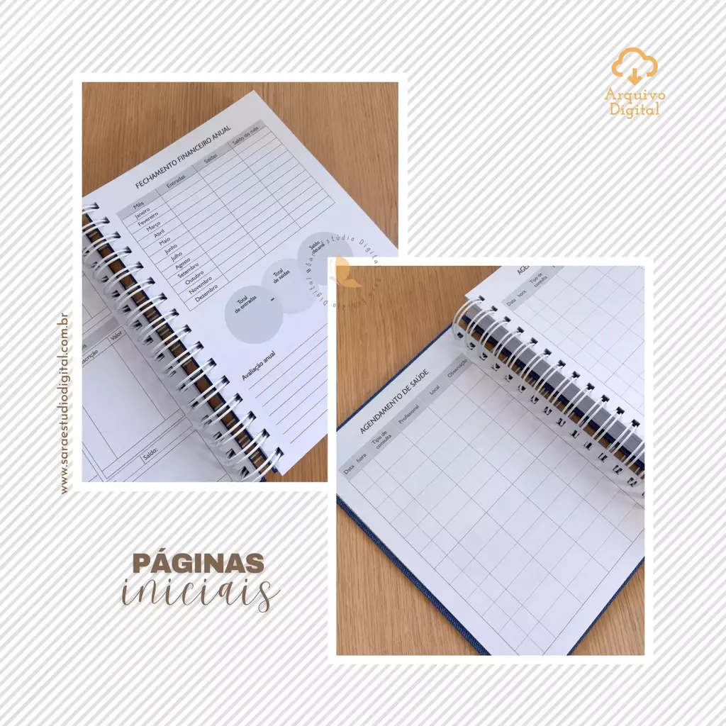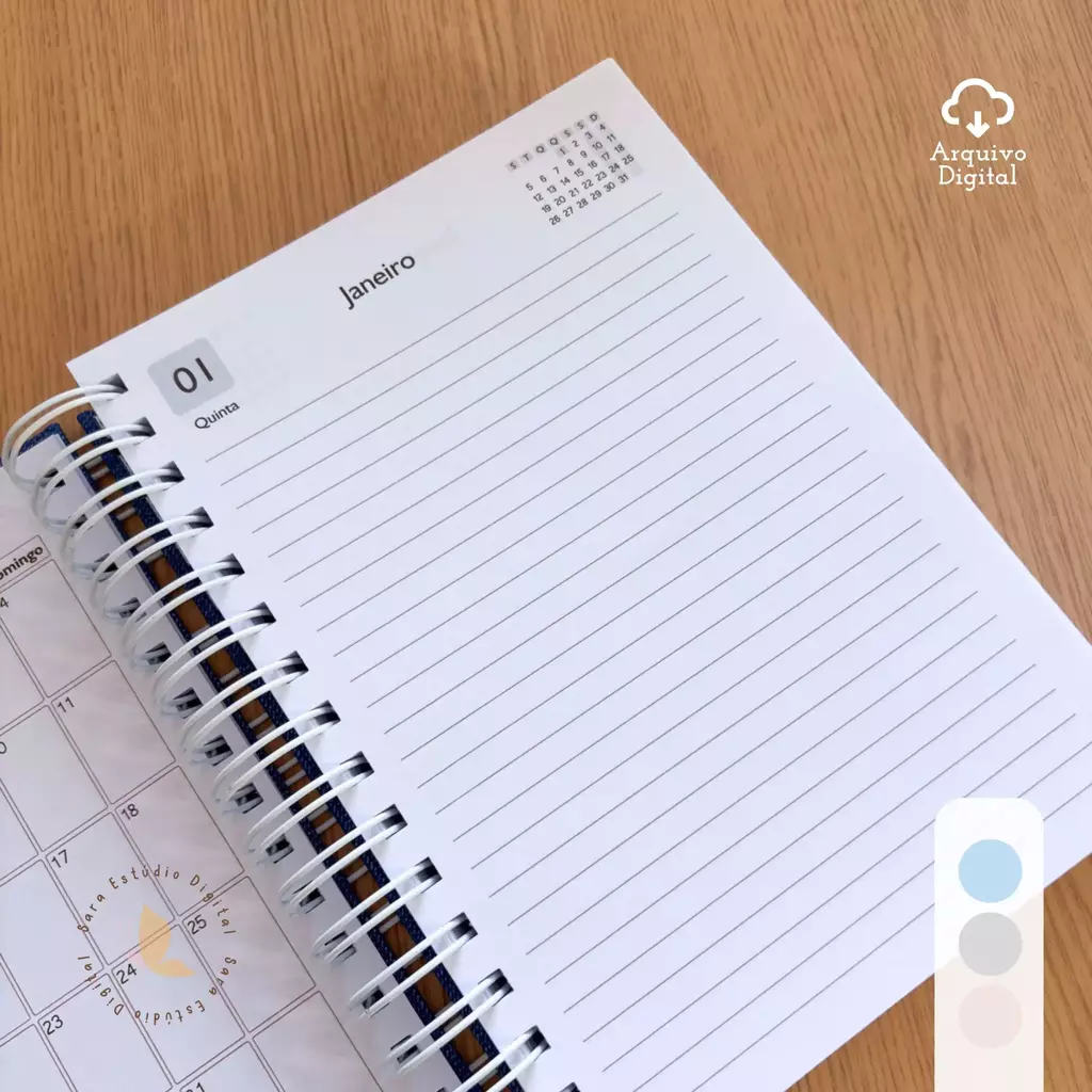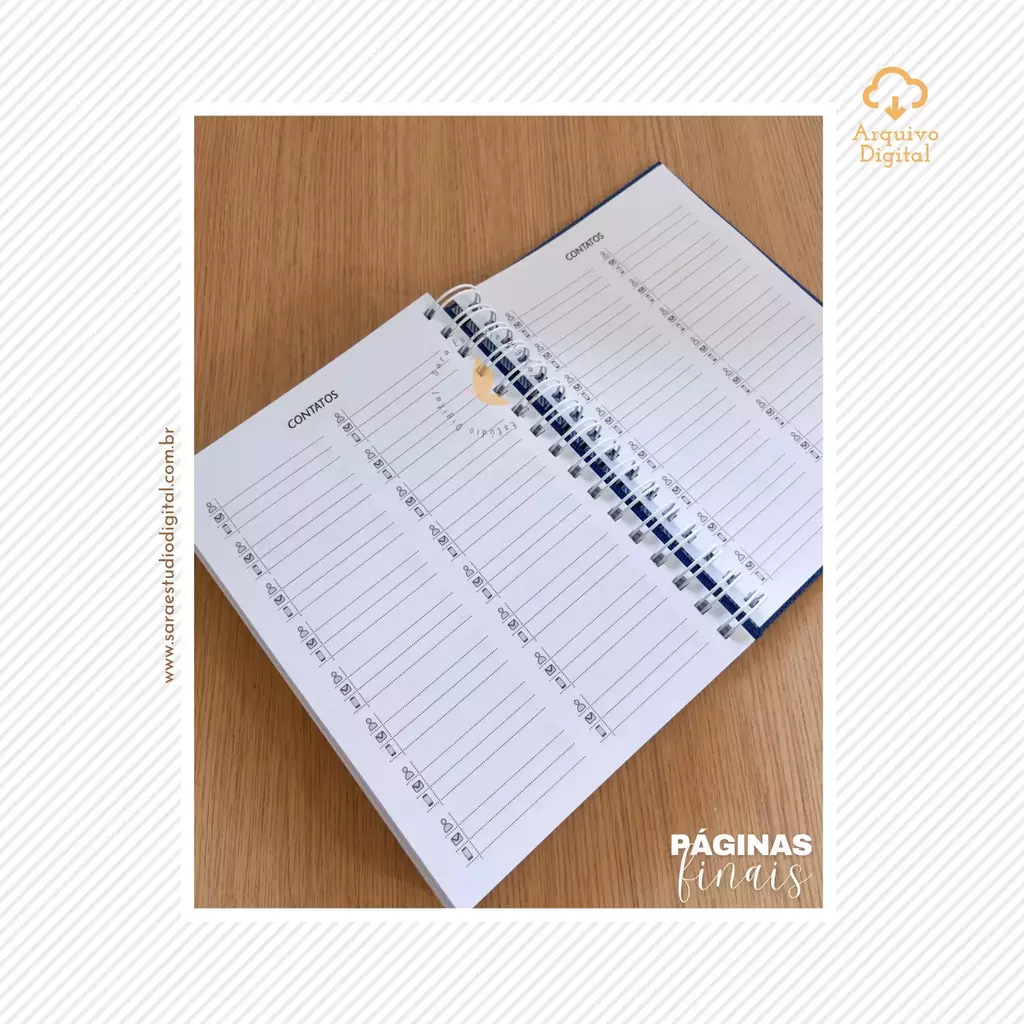1 dia por página (com e sem horário) – 428 páginas (incluso divisórias e planejamento mensal no miolo)